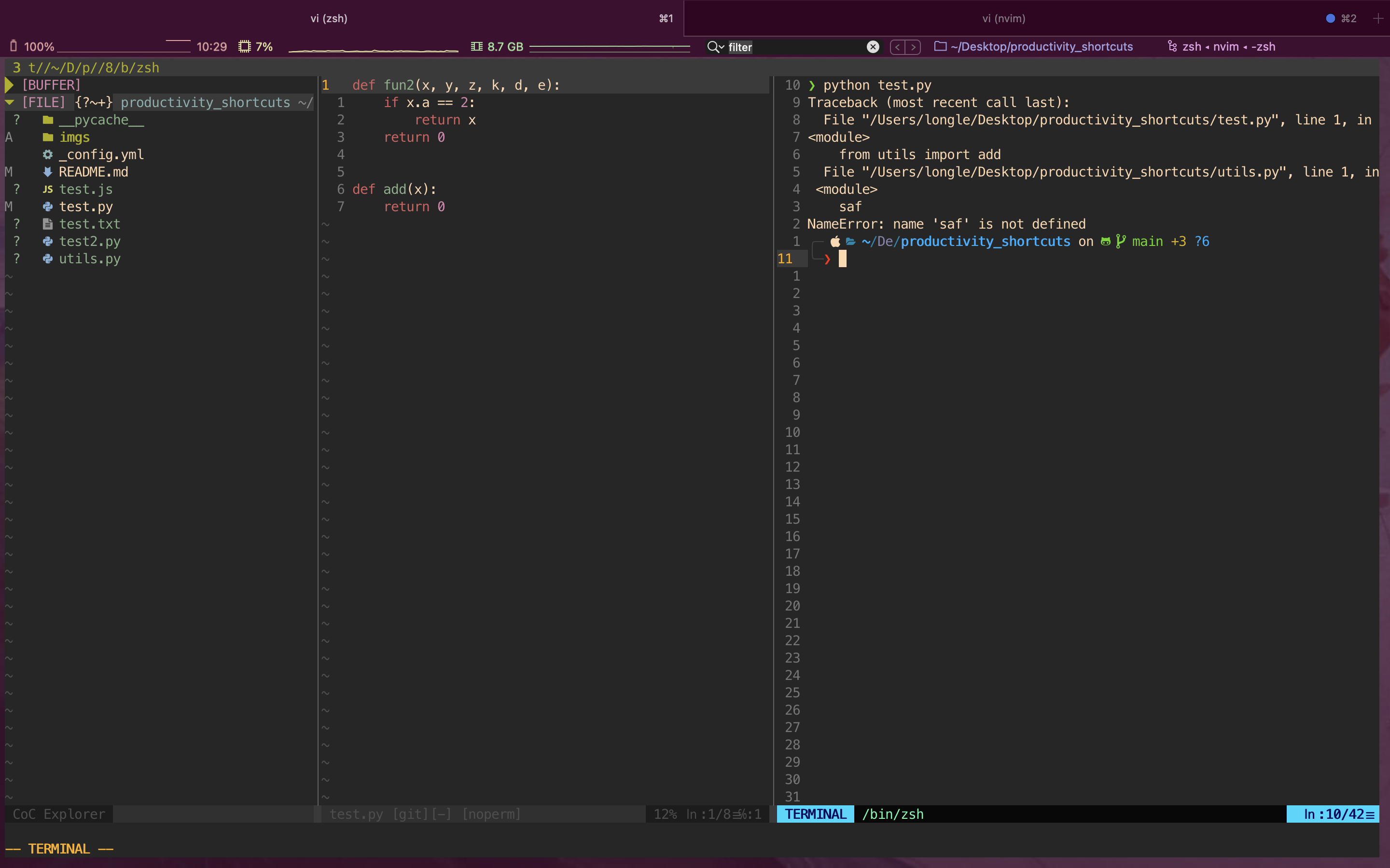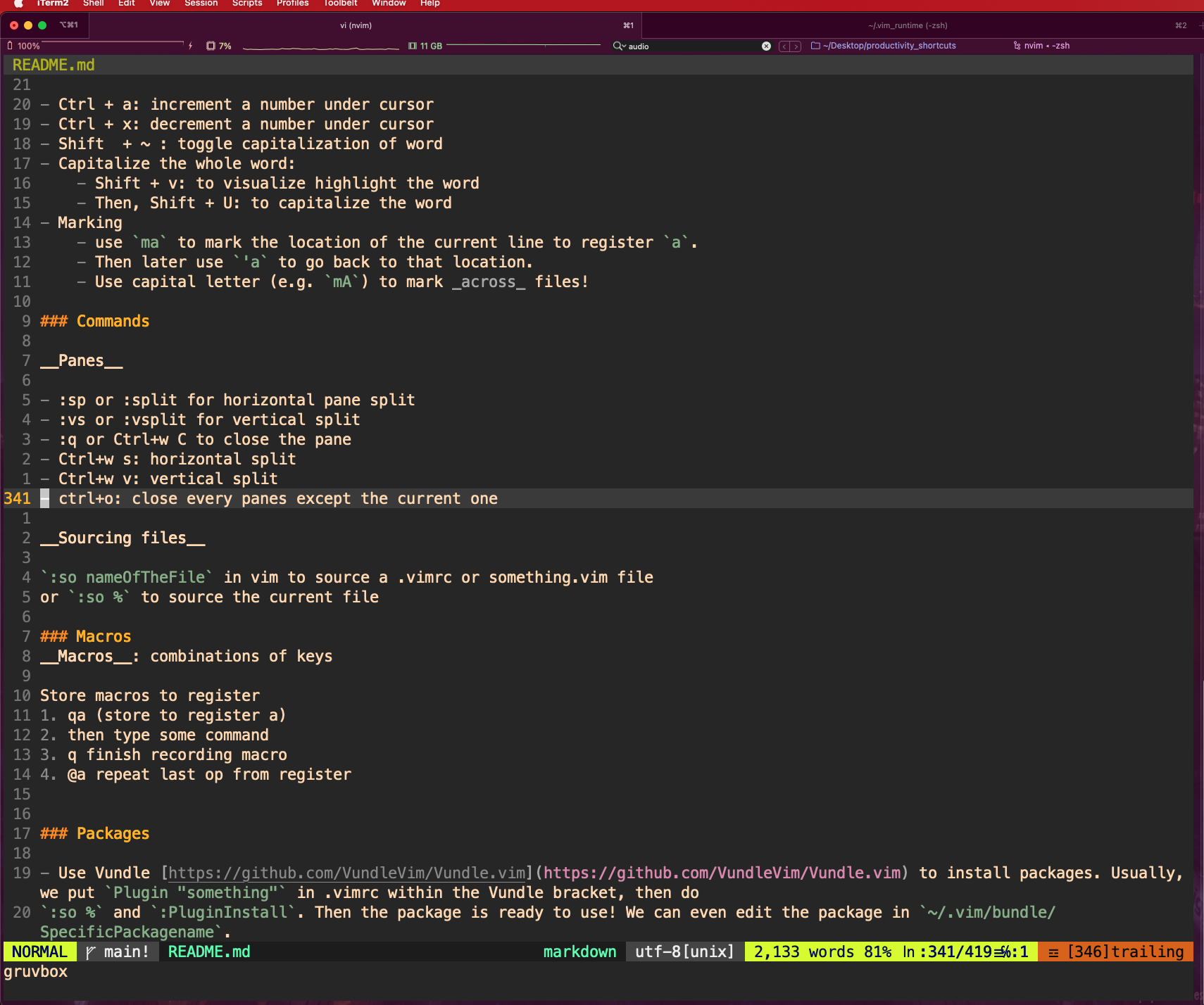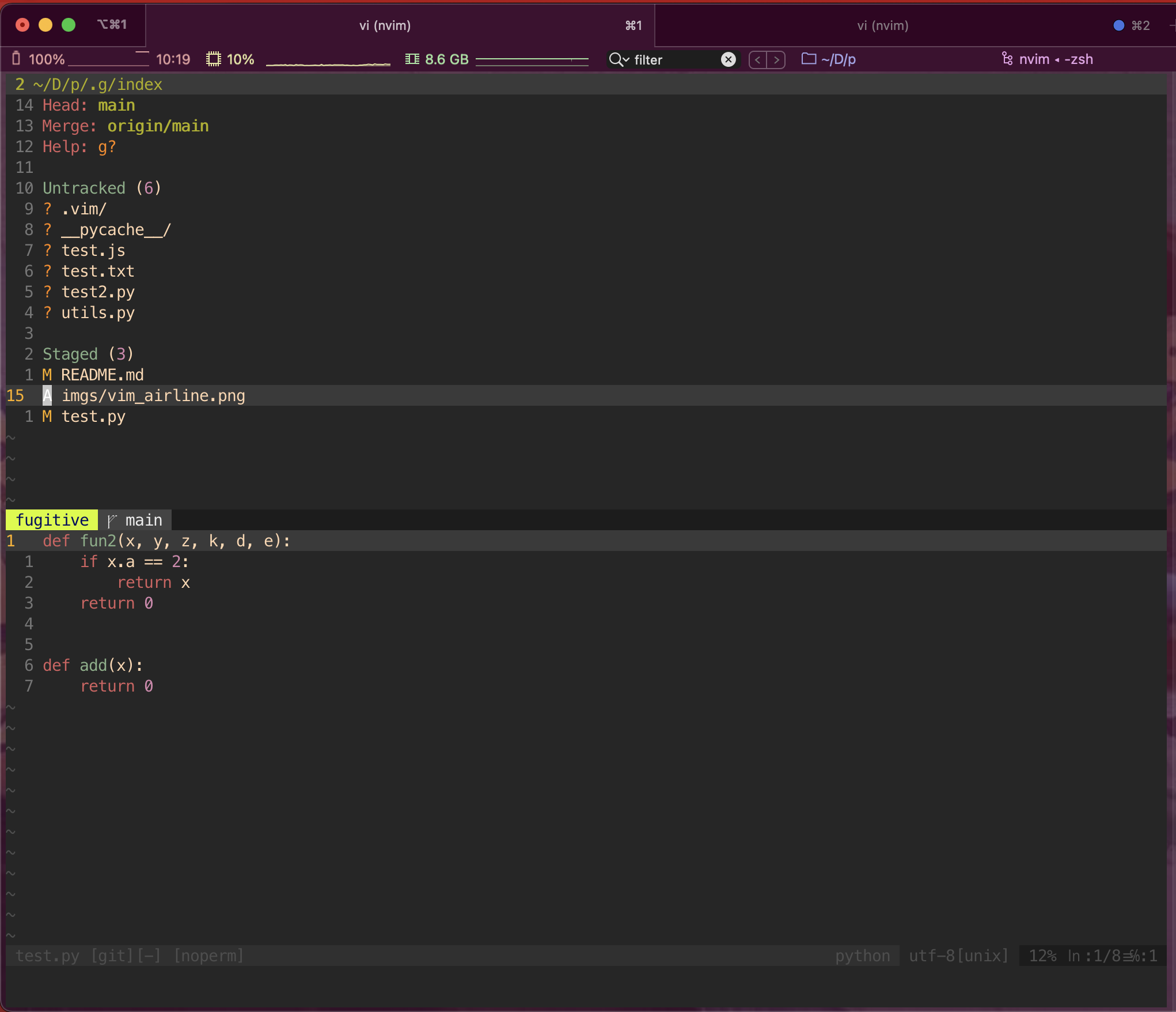 gcto comment/uncomment code block. But most other editors usecmd + /to comment code so I mapcmd + /togcusing the iterm2 trick. (see above in iterm2 remap trick). Note that Vim also doesn’t support the cmd key. - Vim_airline: for awesome status bar at the end.