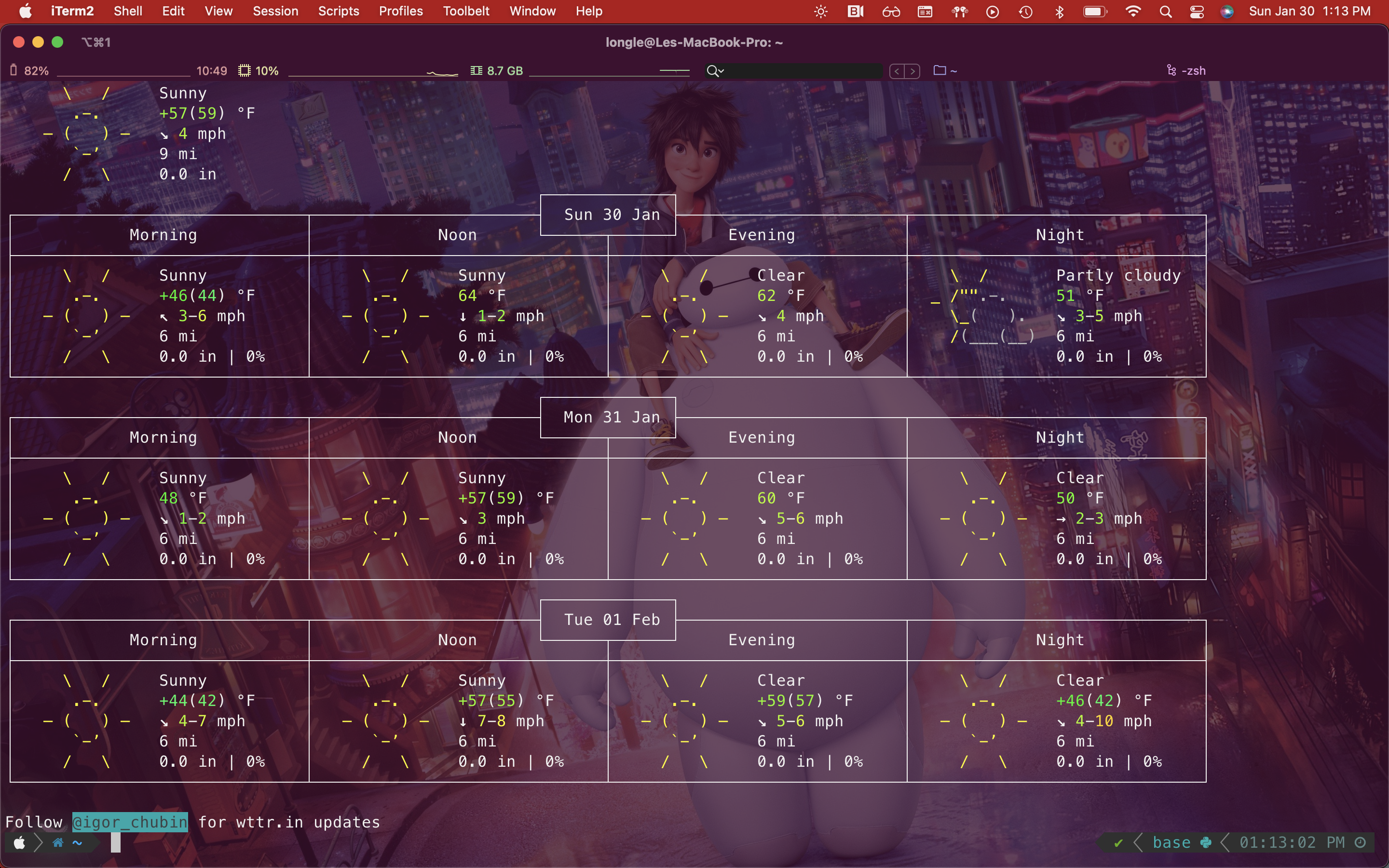 aliasinzhsrcto mapnyancattocd ~/Downloads/go-nyancat && ./go-nyancat. - alias weather=’curl http://wttr.in/’.